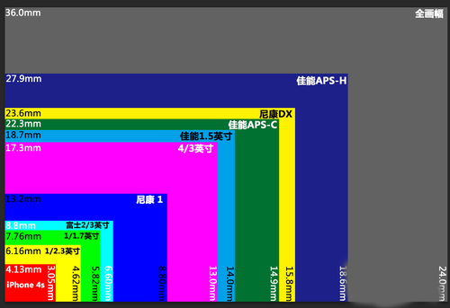 对于相机而言,由于其感光元件尺寸以毫米表示,因此我们很容易推算出其转换系数。而对于感光元件尺寸较小的智能手机来说则十分困难。现在,只要消费者掌握了某款智能手机的感光元件尺寸,就可以计算出感光元件的对角线长度,继而得出转换系数。只要用手机实拍一张照片,用照片EXIF信息中的焦距乘以转换系数,就能够判断这款手机摄像头的广角端到底有多大。
